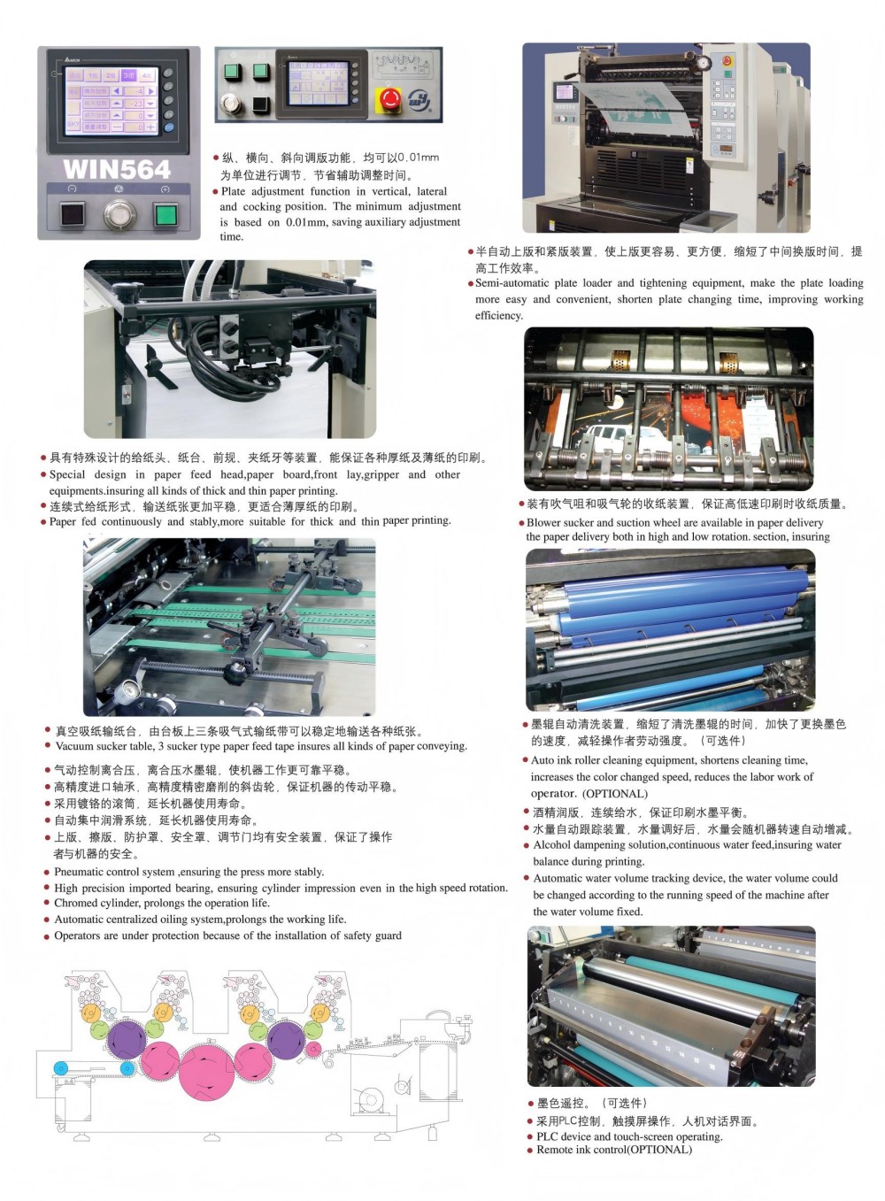 A2 Dört Renkli Etiket Ofset Baskı Makinesi, yüksek performanslı modüllerle tasarlanmıştır ve bunların hepsi en üst kalitededir; yüksek hassasiyetli silindirler ve dişliler, güçlü bir kağıt besleme mekanizması, yüksek hassasiyetli bir kağıt kayıt sistemi ve istikrarlı bir mürekkep besleme sistemi. Yüksek kaliteli, verimli ve uygun fiyatlı tek sayfa renkli baskıya yönelik pazarın gereksinimlerini karşılamak üzere tasarlandı. Yalnızca tek bir kağıt kalınlığına bağlı kalmanıza da gerek yok; ince kağıttan (0,04 mm) kalın kartona (0,4 mm) kadar çalışır. Ayrıca, ayarları ve yazdırma parametrelerini akıllı ve basit bir şekilde ayarlamanıza olanak tanıyan, sezgisel programlama arayüzüne sahip bir dokunmatik ekran kontrolü de bulunmaktadır.