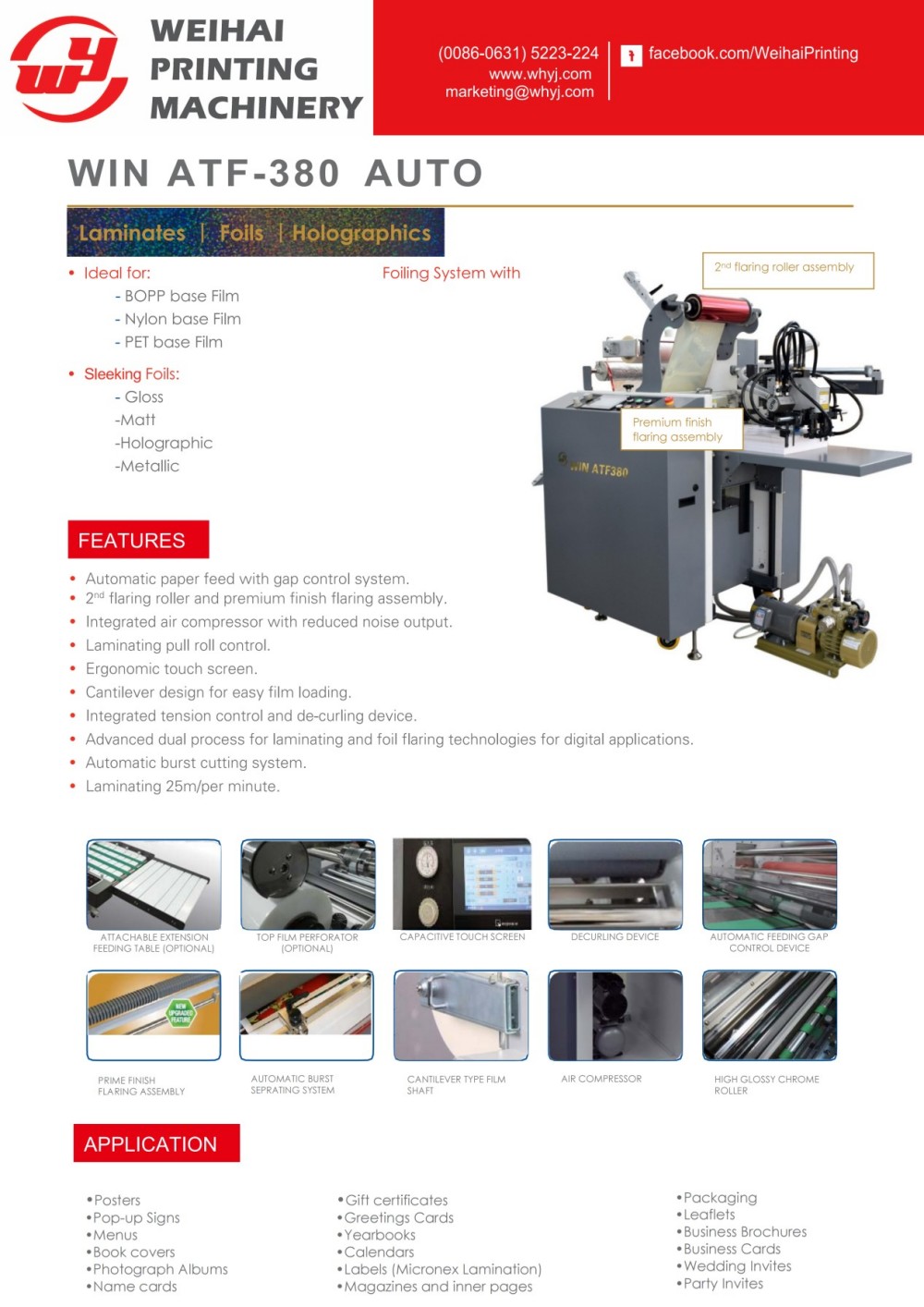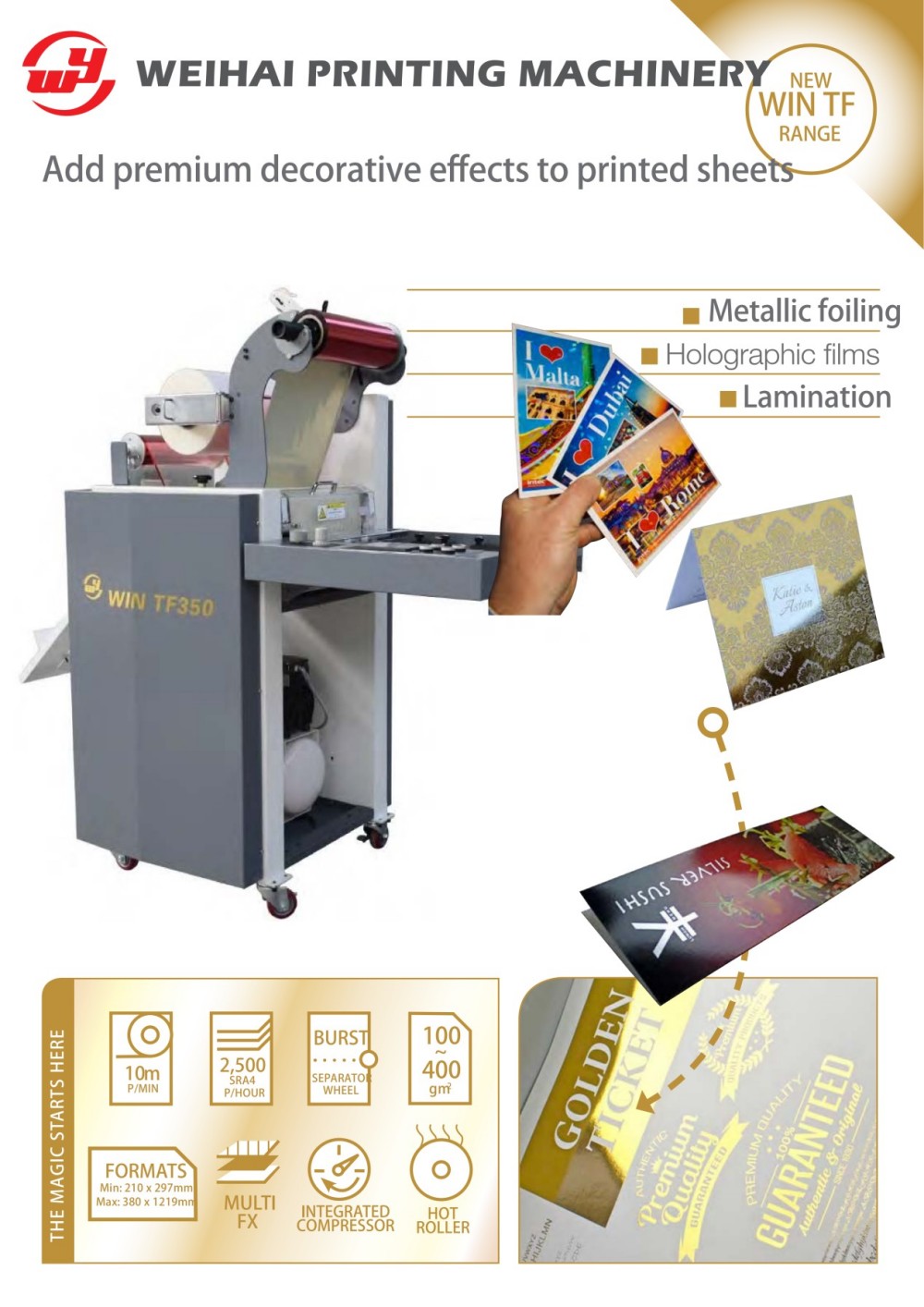 Weihai Printing Machinery Co., Ltd. tarafından tasarlanan ve üretilen Plaka Üretimsiz Laminasyon ve Folyo Makinesi, manuel kağıt beslemeli bir laminasyon ve metal folyolama makinesidir. Kompakt tasarımı, hem laminasyon hem de metal folyolama işlevlerinde paketleme yaparken yerden tasarruf sağlar; şirket içinde dekoratif dokunuşlar eklemek isteyen işletmeler için idealdir. Sıradan basılı malzemeleri, hem isteğe bağlı dijital uygulamalarla hem de geleneksel litografik ofset baskılarla sorunsuz bir şekilde çalışarak mükemmel son ürünlere dönüştürür. Mümkün olan en iyi sonuçları elde etmek için, çalışma sırasında silindir basıncını ve ısıtma sıcaklığını ayarlayan bir elektronik kontrol cihazı ile donatılmıştır. Bu ayarlamalar çalışma hızı, kağıt kalınlığı ve tasarım desenleri gibi faktörlere dayanır. Bu makine, müşterilerin ürünlerine önemli değer katmalarına yardımcı olan birinci sınıf, plaka yapımı gerektirmeyen bir sıcak damgalama ve laminasyon aracı olduğunu kanıtlamıştır. Müşteriler ayrıca, tüm dekoratif ihtiyaçlarını karşılayabilecek geniş bir laminasyon filmi ve metal folyo yelpazesine sahiptir. Ayrıca, afişler ve ekstra uzun basılı materyaller için mükemmel olan genişletilmiş bir kağıt besleme masasına sahiptir.